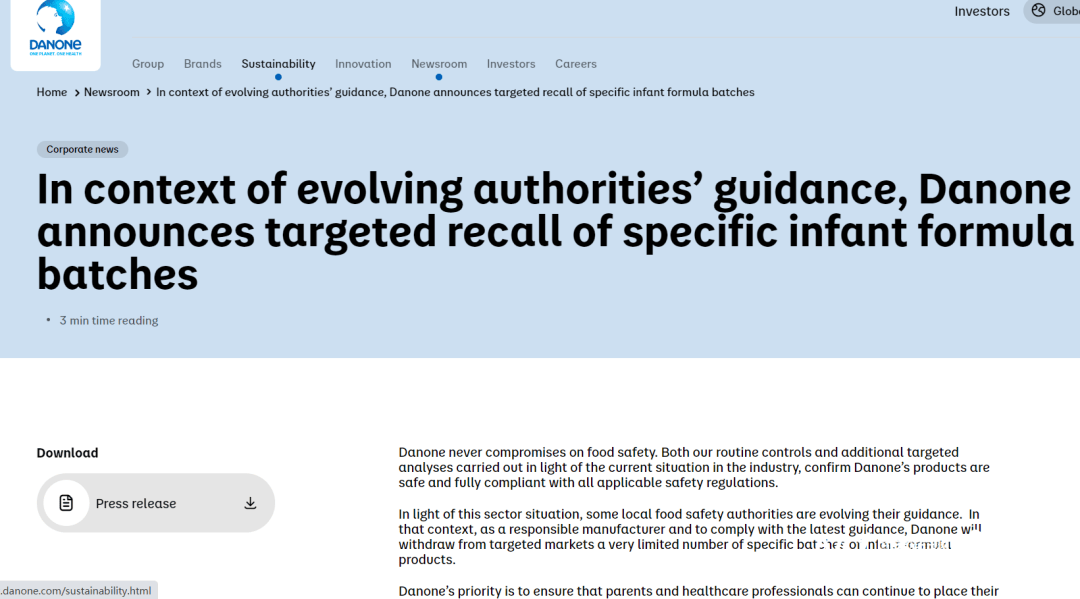 防止性召回是消弭不需要的市场发急取消费者疑虑的环节。达能正正在召回特定批次的婴儿配方奶粉和后续配方奶粉,